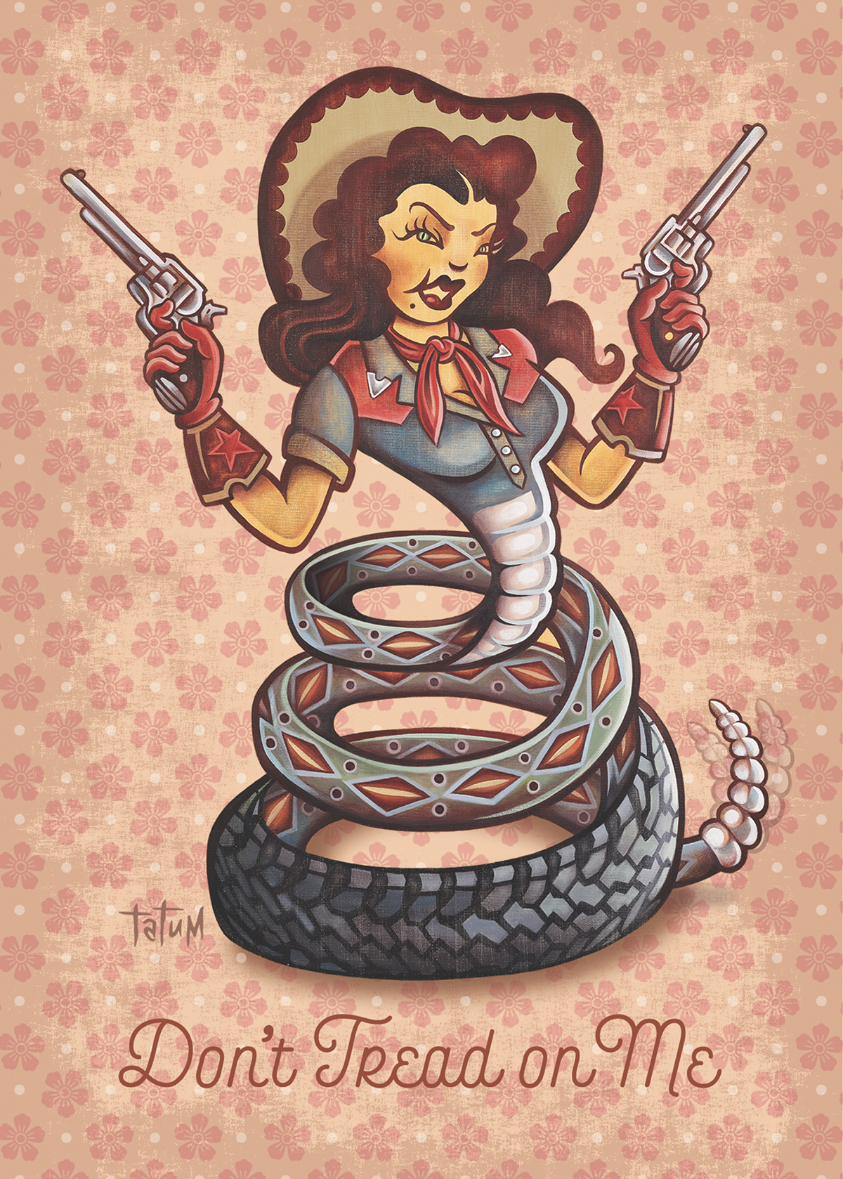A new version of an old classic by Robert Tatum, a gal can't be too careful out there. The original snake woman, but with nice pink flower wallpaper.