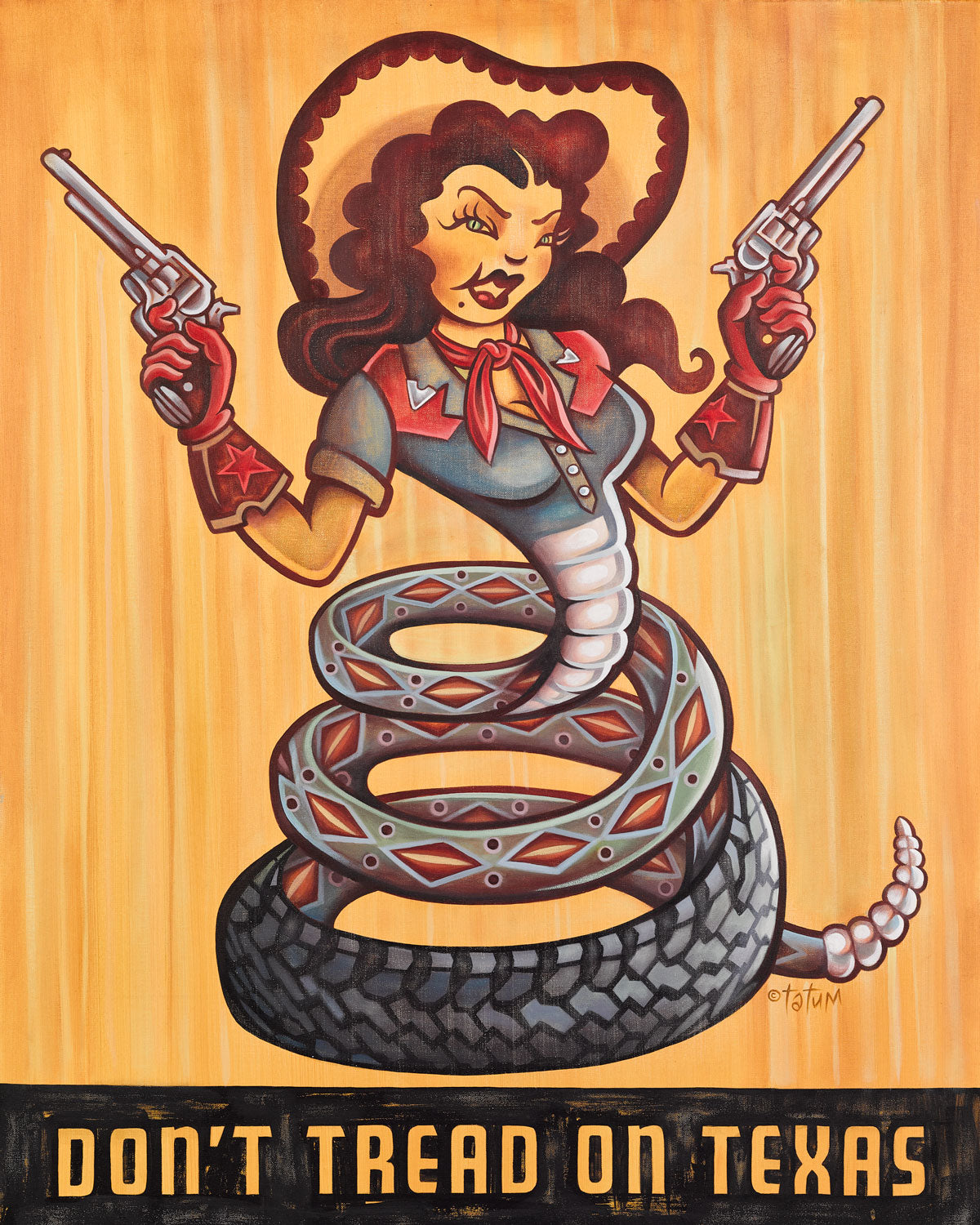 A Classic painting by Robert Tatum, 2015. This snake woman is sporting two six shooters and some tire tread... but don't tread on her or Texas! Printed on archival bright white watercolor paper with premium giclée inks. Available in 4 sizes, 8x10, 11x14 and 16x20. Fits standard frames.