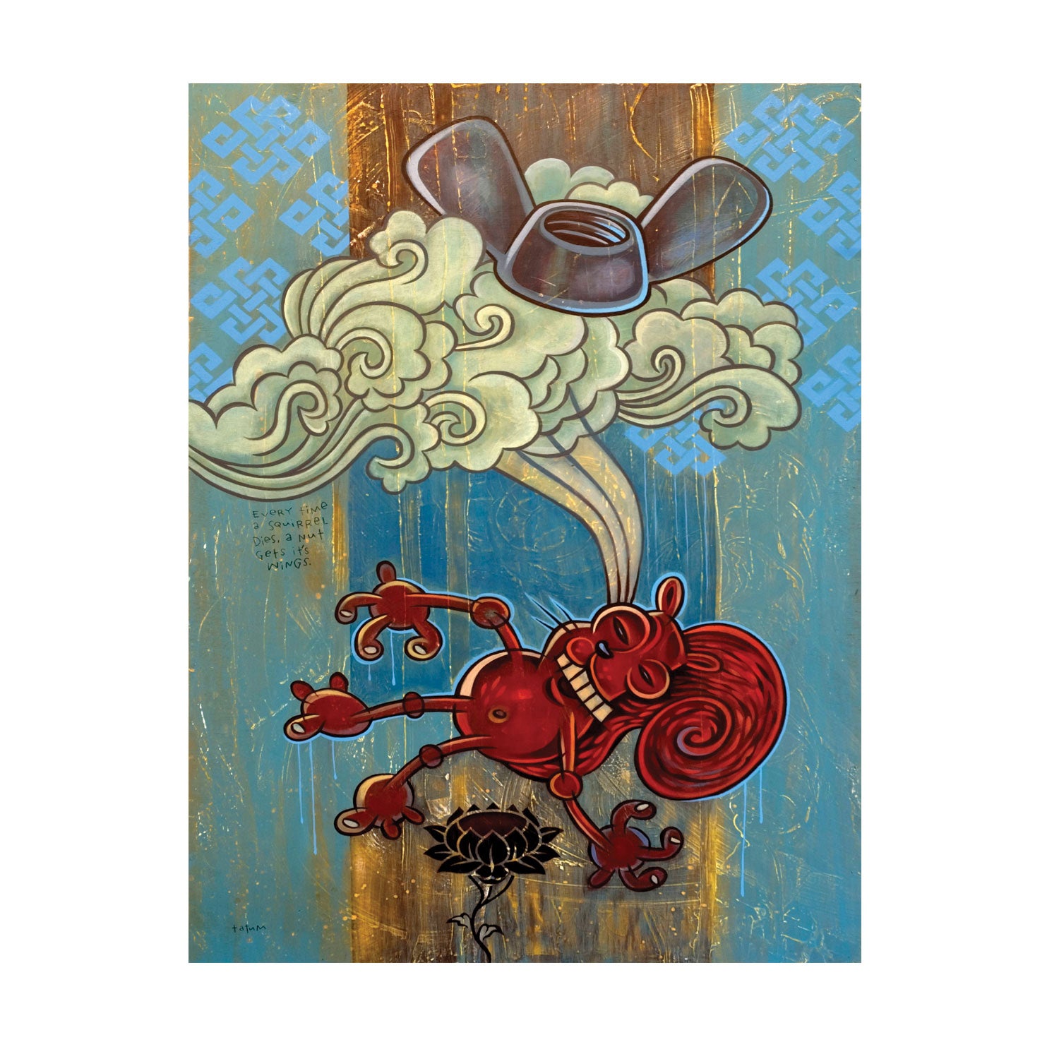 From Robert Tatum's iconic 2008 painting, a crimson squirrel mid-zen float: on top of a golden leafy perch, a wingnut hovers above his head in a stylized cloud. Printed on premium bright white giclee paper with archival inks in a 16"x20" size to fit any standard frame. For framing options, the artist chose a glitzy gold and black 1" frame, complete with reflection-blocking acrylic glazing.