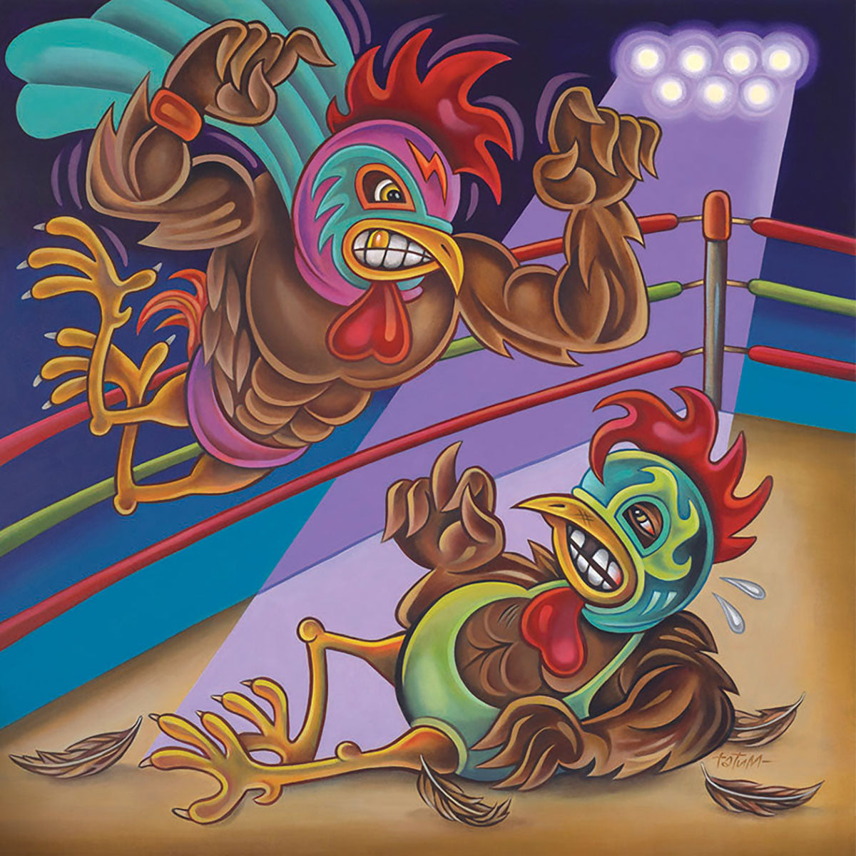 Add a vibrant touch to your space with Robert Tatum's latest artwork, 'Fowl Play.' This eye-catching print features colorful luchador masks and two big roosters battling it out in a lively wrestling match. Bring home this unique piece today!