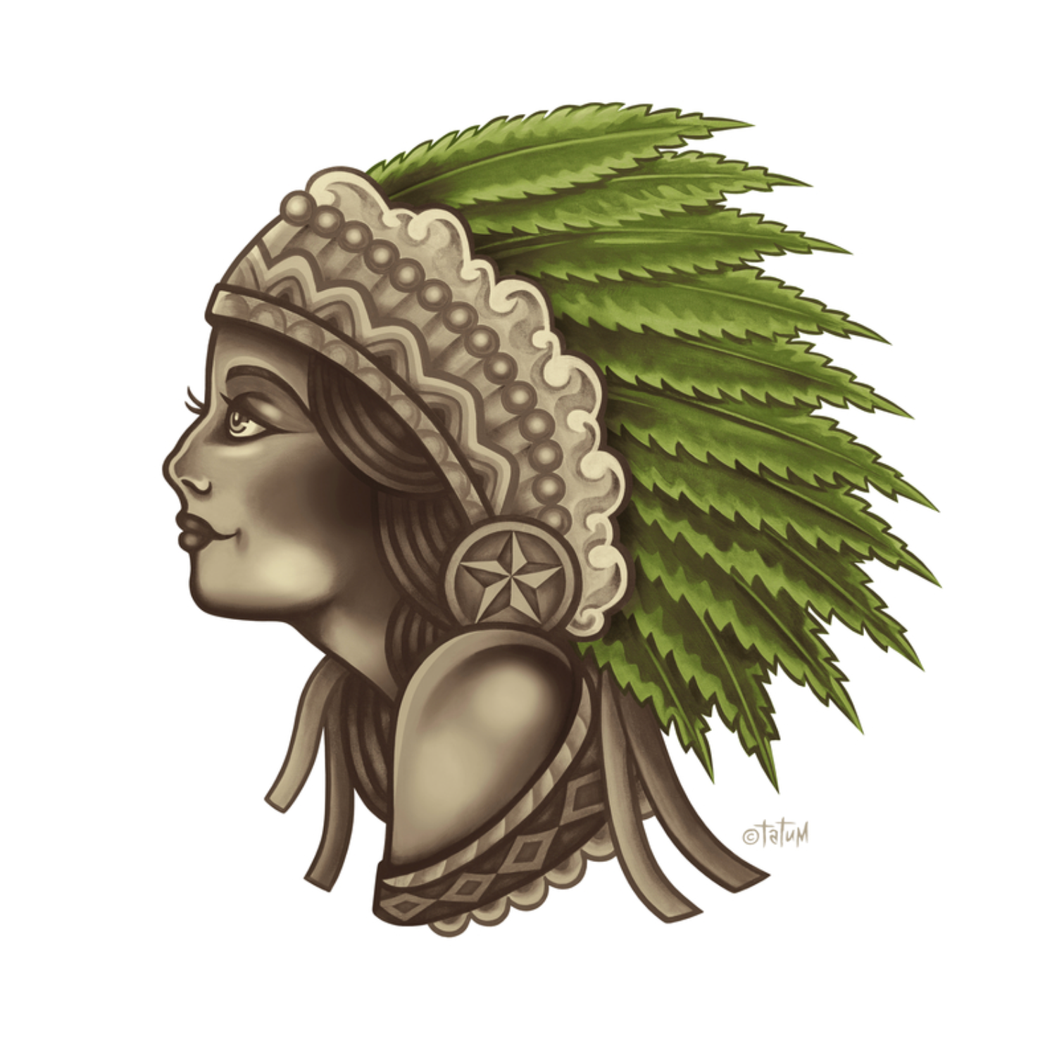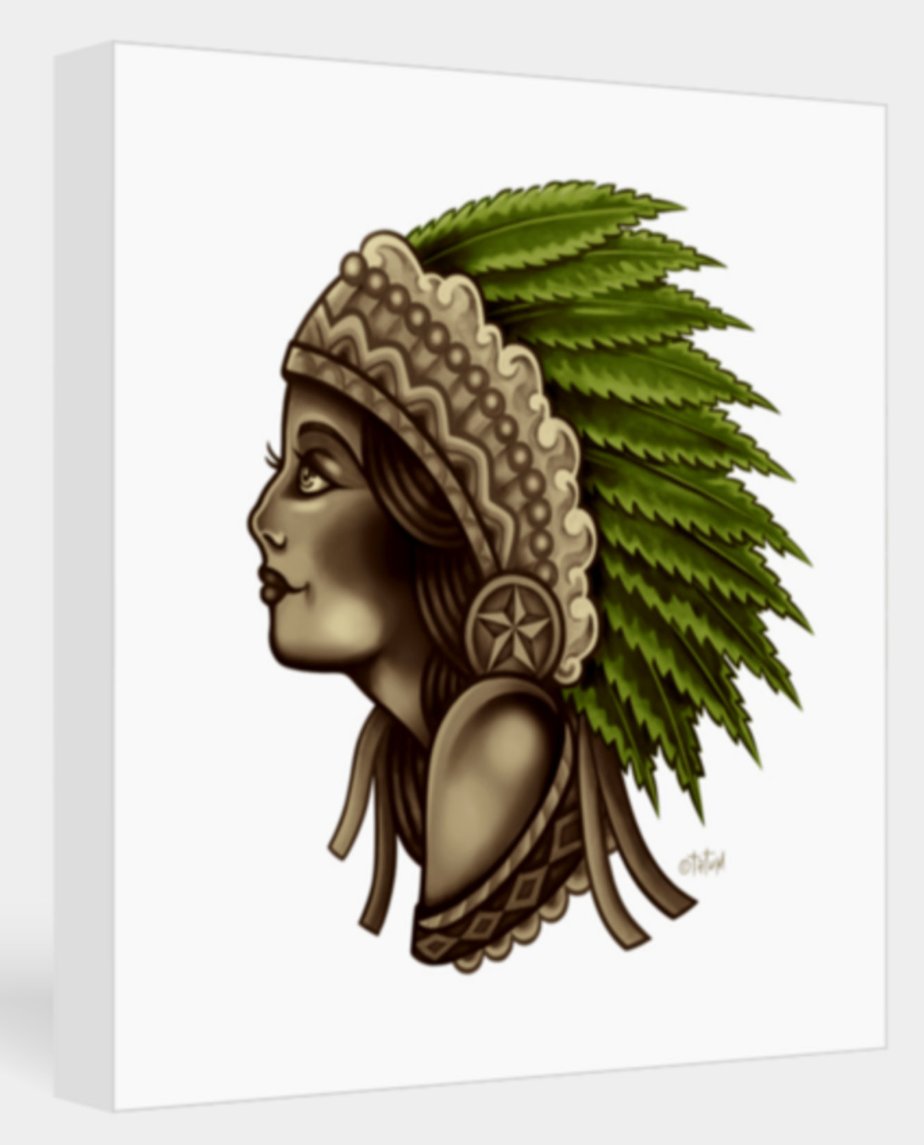 Make a statement with the newest drop from Robert Tatum - the retro Mota Chieftess! This 1930s-inspired tattoo-style looker comes with a regal headdress of green hemp feathers, all printed on archival premium paper with archival inks. This 18x18 Artisan silverada metallic canvas print is professionally stretched, taped and wired, ready to hang on the wall.