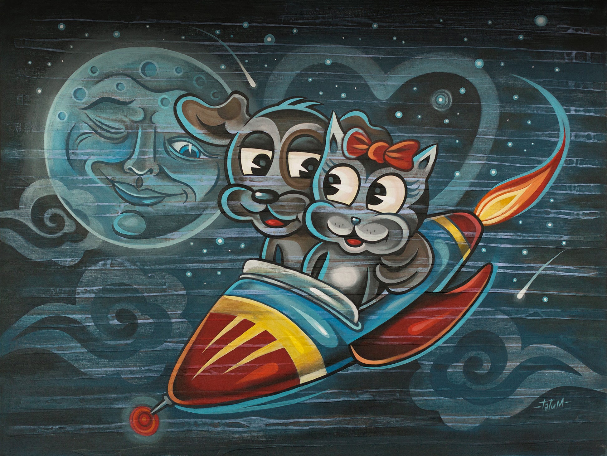 From a commission piece from a husband to his wife, this cute couple, a dog and cat flying in their red, yellow and blue rocket through Tibetan space clouds, stars and a winking moon. Painted by Robert Tatum, with acrylic on canvas, professionally photographed and reproduced on fine art bright white watercolor giclée paper. Available in 3 standard sizes, 10x8, 14x11 and 20x16 which fit standard frames and mats.