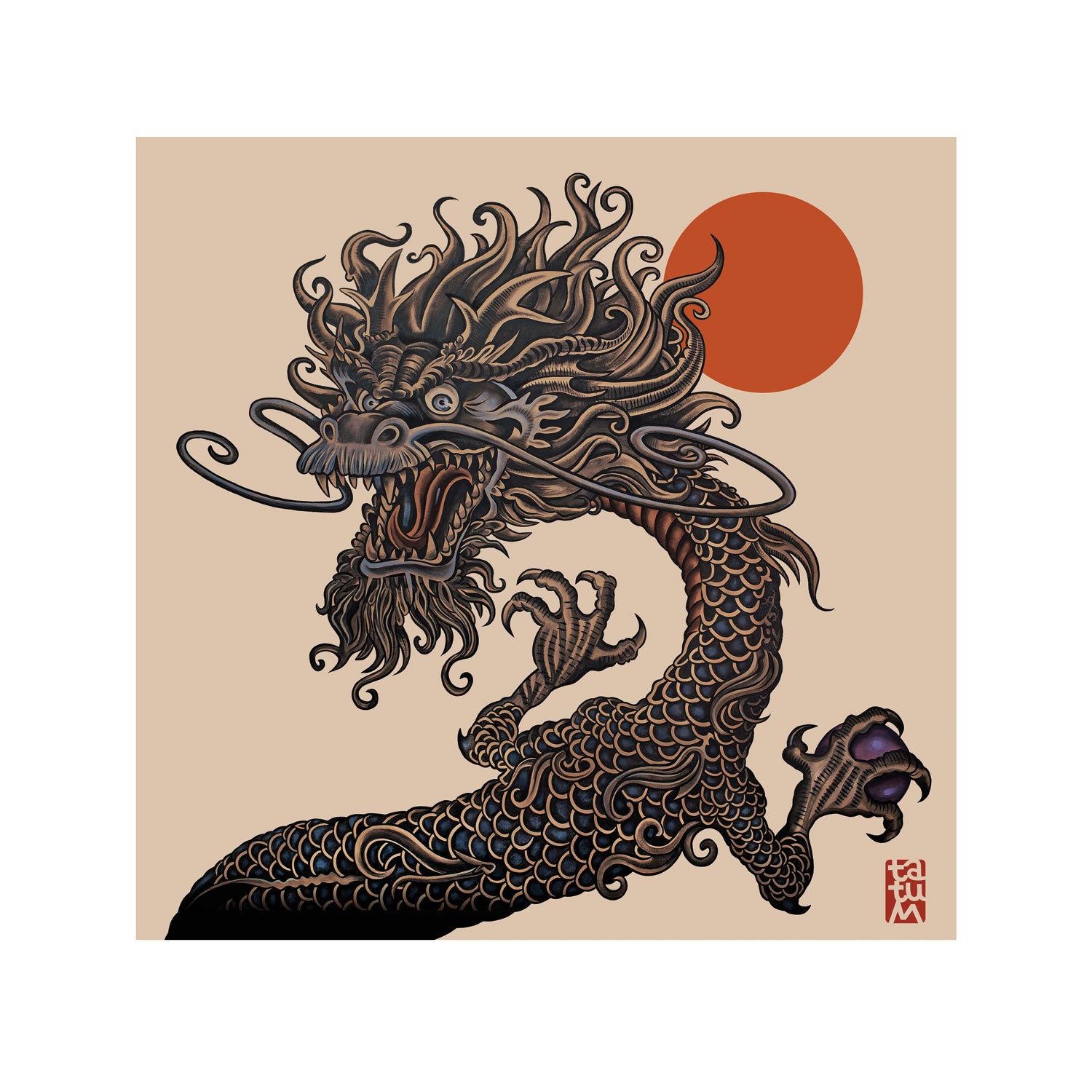 This piece is taken straight from Robert Tatum's art in Hanzo's Bar, San Antonio! A tattoo dragon against a fiery orange-red sun is printed on Giclee paper, 12 x 12", with a pearly metallic sheen to make it really pop! (Plus, you can choose the framed version too: 3/4" Matte Black Frame & Reflection Control glazing).